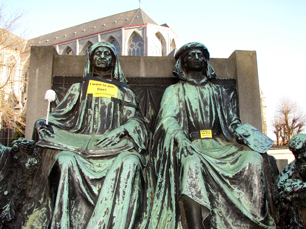 Een groep studenten, Pinkeln.inc heeft in de nacht van 23 op 24 maart een guerrilla-actie ondernomenen en vijf Gentse standbeelden voorzien van een wc-borstel en een tekst ‘I Want to Pee Free’. Hiermee willen ze bij horeca-eigenaars pleiten voor gratis wc-voorzieningen. Ook al moest de oud-stafhouder Hippolyte Metdepenningen aan het Justitie Paleis onmiddellijk zijn wc-borstel afstaan, hielden De Gebroeders van Eyck, Romain De Coninck, Lieven Bauwens en de dames aan de voeten van Jacob Van Artevelde stevig hun wc-borstels in de hand en riepen zij ‘I Want to Pee Free’.